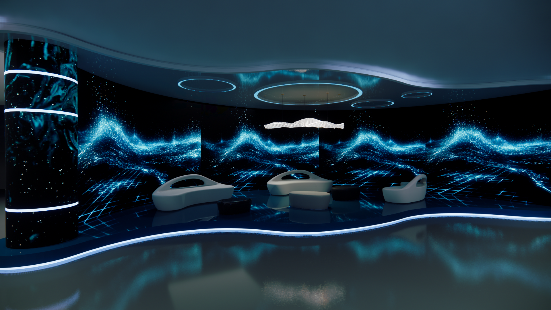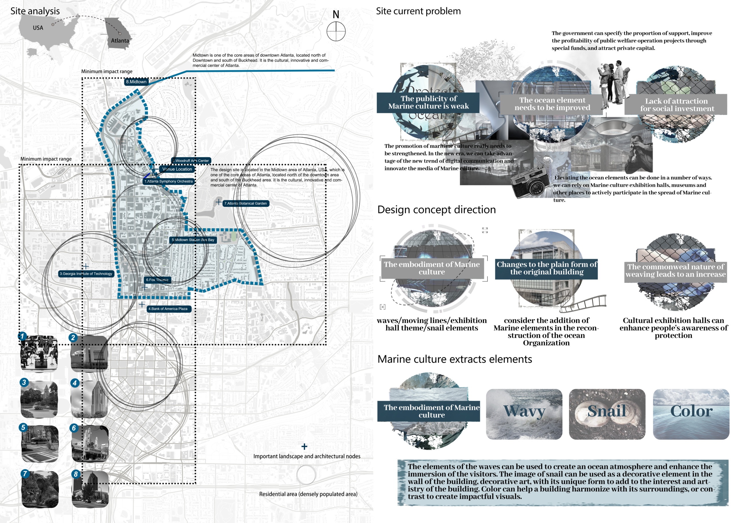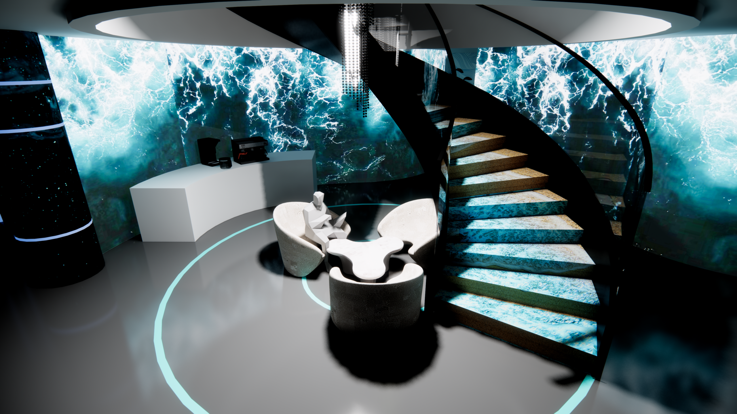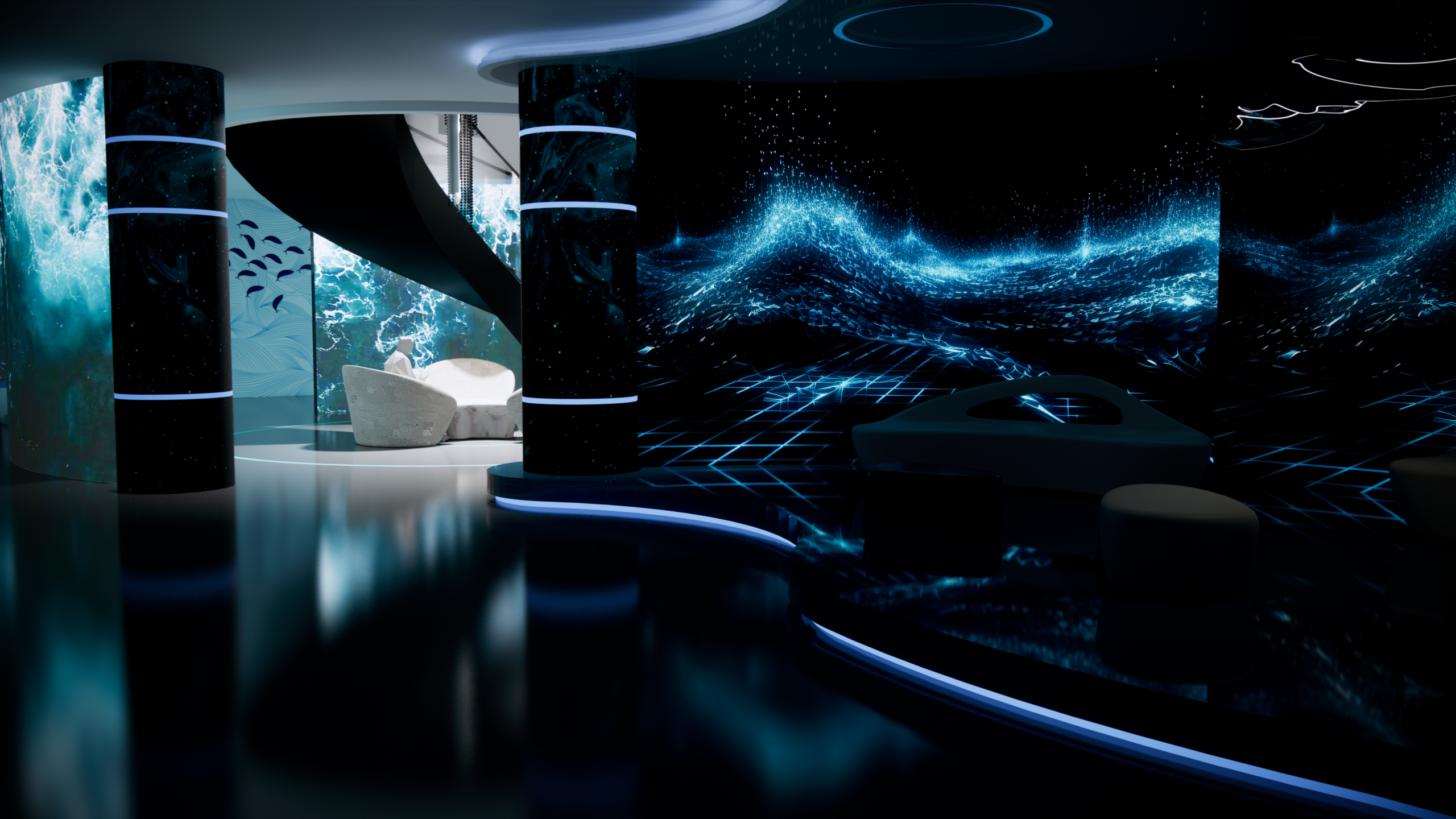 This project designed for the Blue Ribbon Ocean Conservancy reflects a commitment to environmentalawareness and a mission-driven aesthetic. Located in the heart of Midtown Atlanta, this space isdesigned as a dynamic blend of functionality and purpose. Through principles of protection, liquidity,and shine, the design evokes both the strength and fluidity of the marine environment. The protectiveelements ensure a secure and welcoming atmosphere, while liquidity in the layout allows for smoothtransitions between office areas and interactive zones, promoting flexibility for various events andactivities. Shiny accents add visual interest, symbolizing the vibrancy and allure of the ocean,reinforcing the organization’s conservation goals with a sophisticated touch. This design not onlyprovides a practical workspace but also serves as an inspiring venue to engage and educate the community about marine conservation.